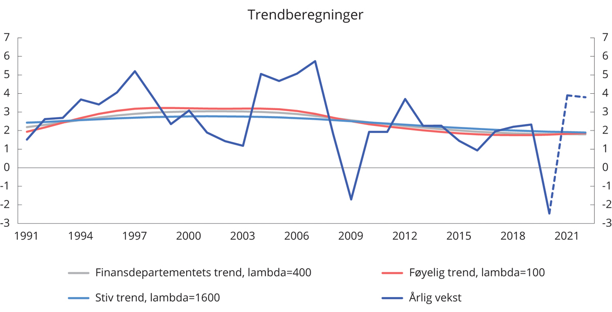 1 Trendveksten er estimert ved Hodrick-Prescott-filter. HP-filter er en mye brukt metode som dekomponerer en tidsserie i en trendkomponent og en konjunkturkomponent.
