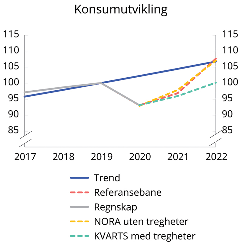 Basert på KVARTS kan man anslå hvordan konsumutviklingen fra 2019 ville vært dersom man så bort fra forstyrrelser som skyldes pandemien. En slik utvikling ville vært om lag i tråd med den historiske trenden i figur 2.17, og ville gitt et konsumnivå for 2022 på linje med anslagene i denne meldingen. Det kan danne en referanse for å vurdere det faktiske konsumforløpet gjennom pandemien og fremover.