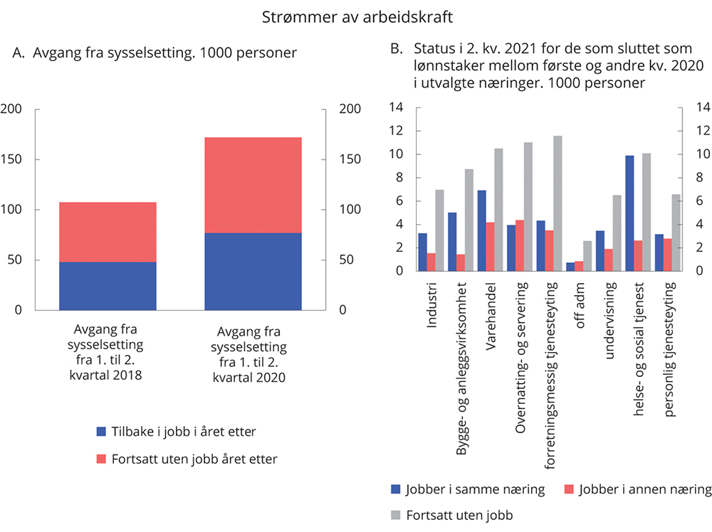 Mange lønnstakere har byttet næring i løpet av pandemien. Målt i forhold til antall lønnstakere var utstrømmingen fra sysselsetting fra første til andre kvartal 2020 særlig stor innen overnattings- og serveringsvirksomhet, forretningsmessig tjenesteyting, og personlig tjenesteyting. Det var også stor utstrømming av lønnstakere fra varehandel. Tallene fra SSB viser at en del lønnstakere som sluttet i jobben i fjor, nå arbeider i andre næringer, se figur 2.18B. Av de snaut 20 000 lønnstakerne som sluttet i jobben i overnattings- og serveringsvirksomhet fra første til andre kvartal i fjor, var 8 000 personer tilbake som lønnstakere i andre kvartal i år. Mer enn halvparten av disse jobbet da i en annen næring. På den annen side var det også noen flere nye ansatte i denne næringen i andre kvartal 2021 som arbeidet i andre næringer før pandemien. Av de som sluttet i jobb innen forretningsmessig tjenesteyting, personlig tjenesteyting og i varehandel i fjor, er det også en nokså høy andel som arbeider i andre næringer. Blant personer som mistet jobben i fjor innen bygg og anlegg og i industrien, er derimot de fleste kommet tilbake i jobb i den samme næringen.