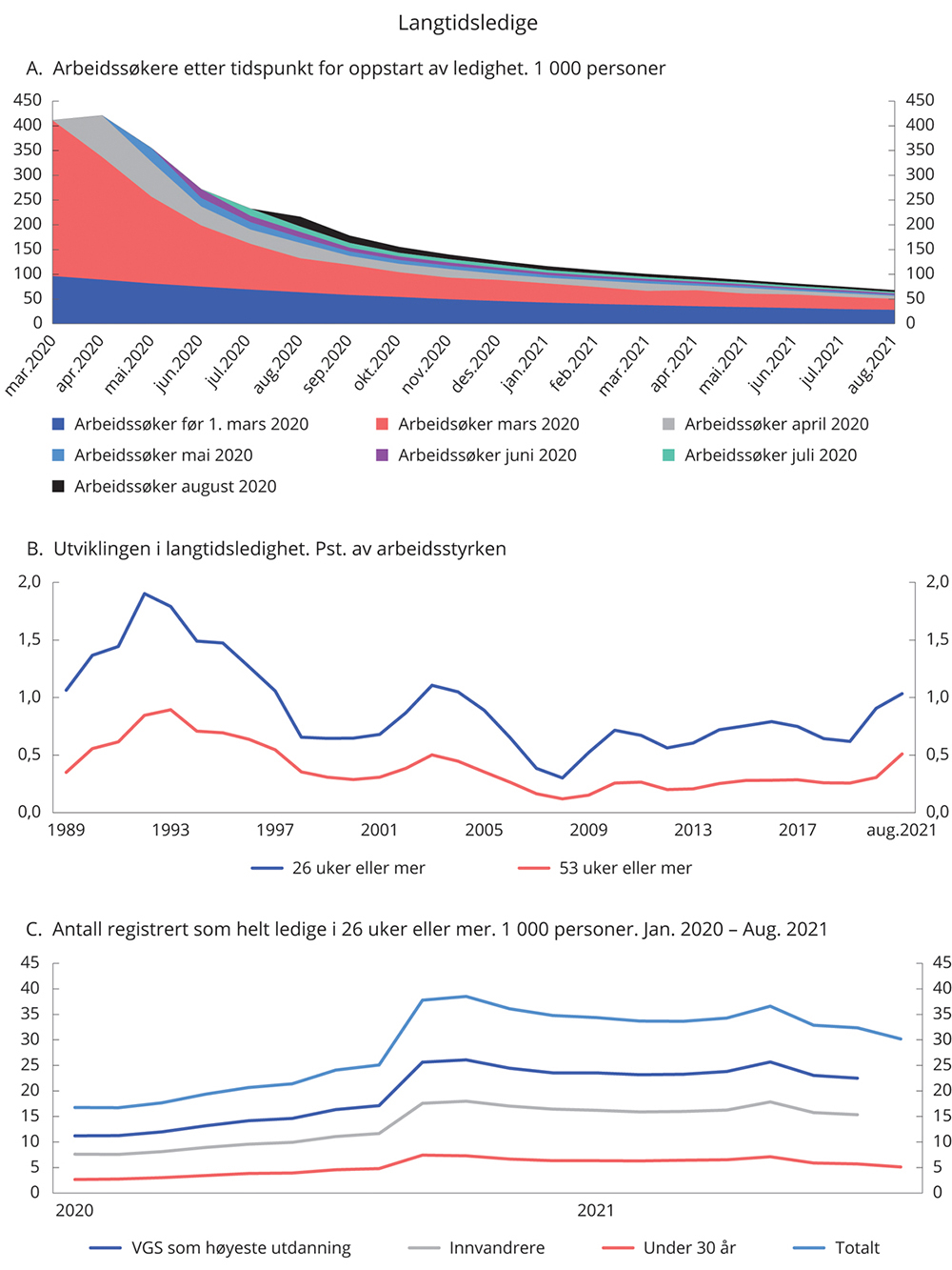 Det er likevel betydelig flere langtidsledige enn i en normalsituasjon. Langtidsledigheten, definert som personer som har vært registrert som helt ledige i 26 uker eller mer, har ikke vært høyere siden 2003, se figur 2.19B. Langtidsledigheten er høyere enn både under oljeprisfallet 2014–2016 og under finanskrisen, men likevel betydelig lavere enn under den økonomiske krisen sent på 1980-tallet og tidlig på 1990-tallet (bankkrisen). Permitterte har stått for 40 pst. av økningen i langtidsledigheten siden før koronapandemien, og utgjør nå 20 pst. av de langtidsledige. Mens antall permitterte langtidsledige er blitt nesten halvert siden utgangen av mai, har antallet ordinære langtidsledige holdt seg stabilt.
