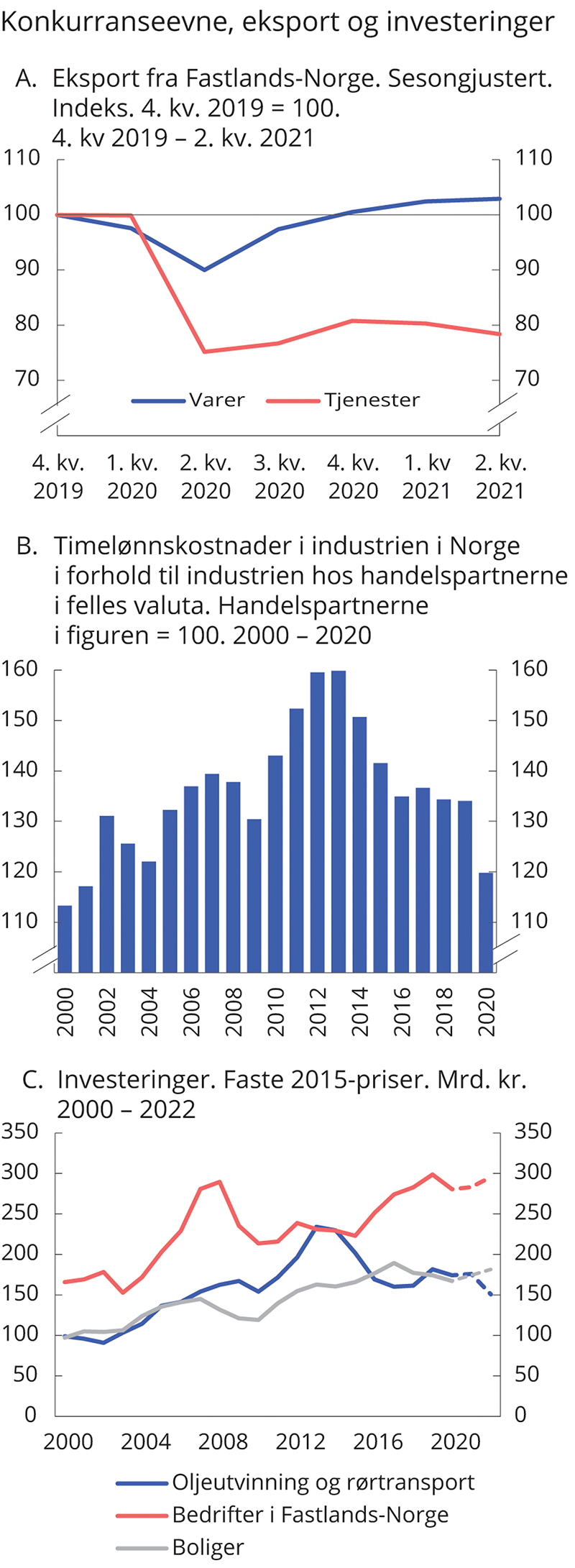 Den økonomiske utviklingen ute er bedre enn ventet, og vil gi høyere vekst i norsk fastlandseksport enn lagt til grunn i revidert nasjonalbudsjett. Vareeksporten har allerede tatt seg opp til høyere nivåer enn før pandemien. Eksporten av tjenester fra fastlandet ligger derimot klart lavere enn før pandemien som følge av at det fortsatt er få utenlandske turister i Norge, se figur 2.2A. Den markerte bedringen i konkurranseevnen siden 2014 legger til rette for økt aktivitet i deler av næringslivet som konkurrerer med utlandet, se figur 2.2B.
