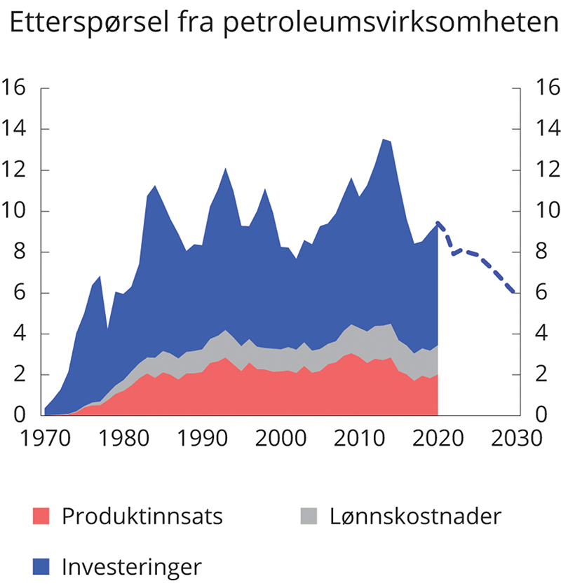 Gjennom det første tiåret etter tusenårsskiftet økte oljeavhengigheten, og etterspørselen fra petroleumssektoren nådde en topp i 2013. Deretter har oljeavhengigheten gått ned. Målt som andel av fastlands-BNP gikk etterspørselen fra sektoren ned fra 13,5 pst. i 2013 til 9,4 pst. i 2020, se figur 2.20. Det er i første rekke lavere nivå på investeringene som har bidratt til nedgangen.