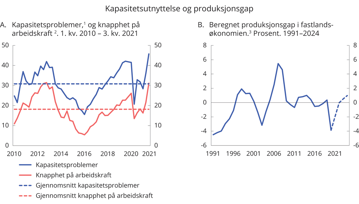 Oppgangen i aktiviteten bidrar til at vi nå går fra en situasjon der kapasitetsutnyttelsen er lavere enn normalt, til en situasjon der den er høyere enn normalt. Ikke siden mai 2008 har en større andel av bedriftene i Norges Banks regionale nettverk meldt om full kapasitetsutnyttelse, se figur 2.3A. Også SSBs konjunkturbarometer viser at andelen av industribedriftene som nå melder om kapasitetsproblemer, er høyere enn det historiske gjennomsnittet. Flaskehalser blant annet i arbeidsmarkedet bidrar til kapasitetsproblemene, og demper nå veksten i norsk økonomi. Vanskeligheter med å få tak i utenlandsk arbeidskraft begrenser produksjonen mest, særlig i bygge- og anleggsnæringen og i tjenesteytende næringer. Råvaretilgang og leveringsutfordringer er også begrensende faktorer. Med så tydelige tegn til at flaskehalser bygger seg opp, er det viktig at den økonomiske politikken strammes til i tide. Hvis ikke, kan det føre til tiltakende lønns- og prispress som kan gi opphav til høyere arbeidsledighet og lavere sysselsetting.