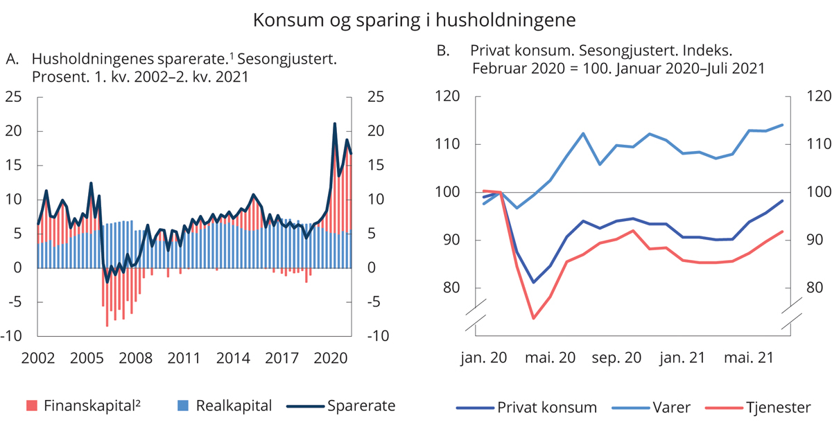 Fremskrivingene i denne meldingen innebærer at privat forbruk i 2022 vil ta seg godt opp, se figur 2.17. I historien som de økonomiske beregningsmodellene er tallfestet utfra, har husholdningene endret konsumet når inntektene har endret seg, men tilpasningen har som regel tatt tid og skjedd gradvis. Anslagene i denne meldingen bygger på en antakelse om at husholdningene nå vil ønske å øke konsumet vesentlig raskere enn det de historisk har gjort. Det forklares med at nedstenging og begrensninger under pandemien hindret husholdningene i å forbruke, særlig tjenester, slik at sparingen ble ufrivillig høy. Husholdningene har spart mye, og vi anslår at de fremover vil bruke en del av de oppsparte midlene til å øke konsumet.