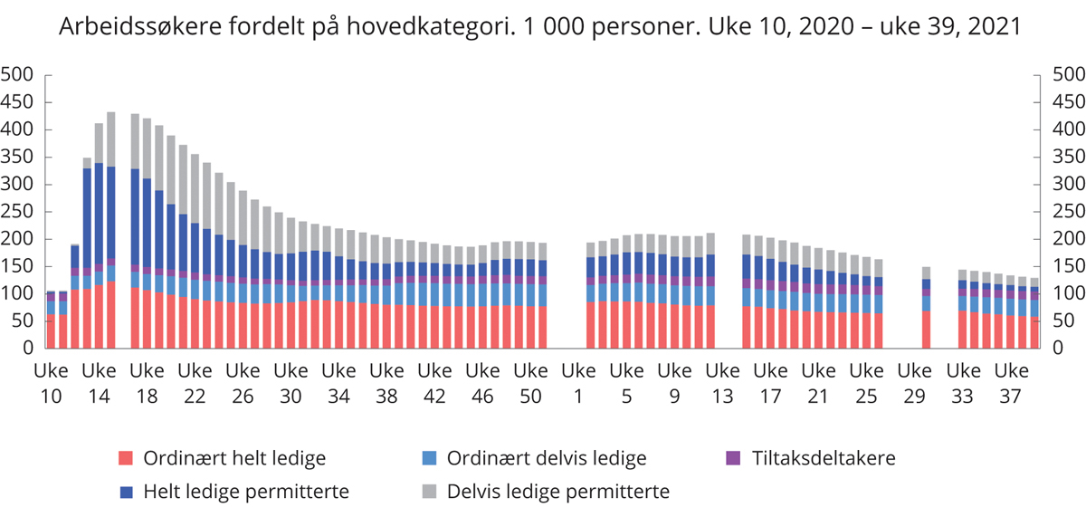 Det har så langt i år vært en betydelig nedgang i helt og delvis ledige, og det er særlig de permitterte som er tatt tilbake i jobb. Ved utgangen av september var det registrert 67 600 helt ledige, hvorav 8 800 er permitterte. Det tilsvarer 2,4 pst. av arbeidsstyrken. Justert for sesongvariasjoner er det ved utgangen av september i underkant av 40 000 færre helt ledige enn ved inngangen til året, tilsvarende en nedgang på 1,4 prosentenheter. Antallet delvis ledige har også blitt redusert. Det var ved utgangen av september registrert 129 600 arbeidssøkere, hvorav 24 800 var permitterte. Justert for sesongvariasjoner er det rundt 60 000 færre enn ved årsskiftet og bare 38 000 flere enn før pandemien.