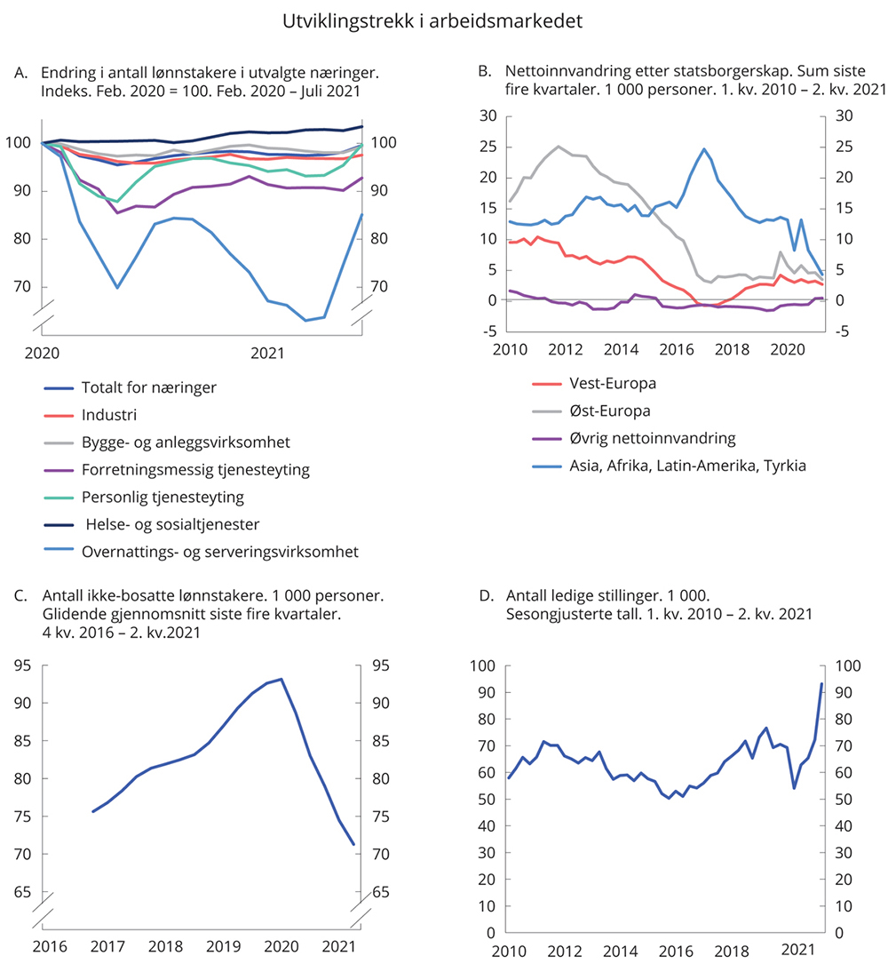 Blant annet som følge av strenge innreiserestriksjoner er det langt færre utenlandske arbeidstakere på korttidsopphold i Norge enn før pandemien, se figur 2.6C. Det har særlig gitt lavere sysselsetting i forretningsmessig tjenesteyting, som inkluderer bemanningsselskaper, og i bygg og anlegg. I juli 2021 var det registrert like mange lønnstakere samlet sett som i juli 2019, men antall ikke-bosatte lønnstakere var 35 pst. lavere. Den reduserte tilgangen på arbeidskraft fra utlandet har bidratt til å redusere det samlede tilbudet av arbeidskraft, og bedrifter i mange næringer har problemer med å fylle ledige stillinger. Samtlige næringer i Norges Banks regionale nettverk rapporterer om at knapphet på arbeidskraft nå begrenser produksjonen, og utfordringene er størst innen bygg og anlegg og tjenesteyting. I enkelte næringer kan innenlandsk arbeidskraft til en viss grad ha erstattet lønnstakere som har forlatt landet. Blant annet har nedgangen i antall ikke-bosatte lønnstakere i bygge- og anleggsnæringen fra juli 2019 til juli 2021 blitt fullt ut motsvart av flere bosatte lønnstakere i denne næringen.