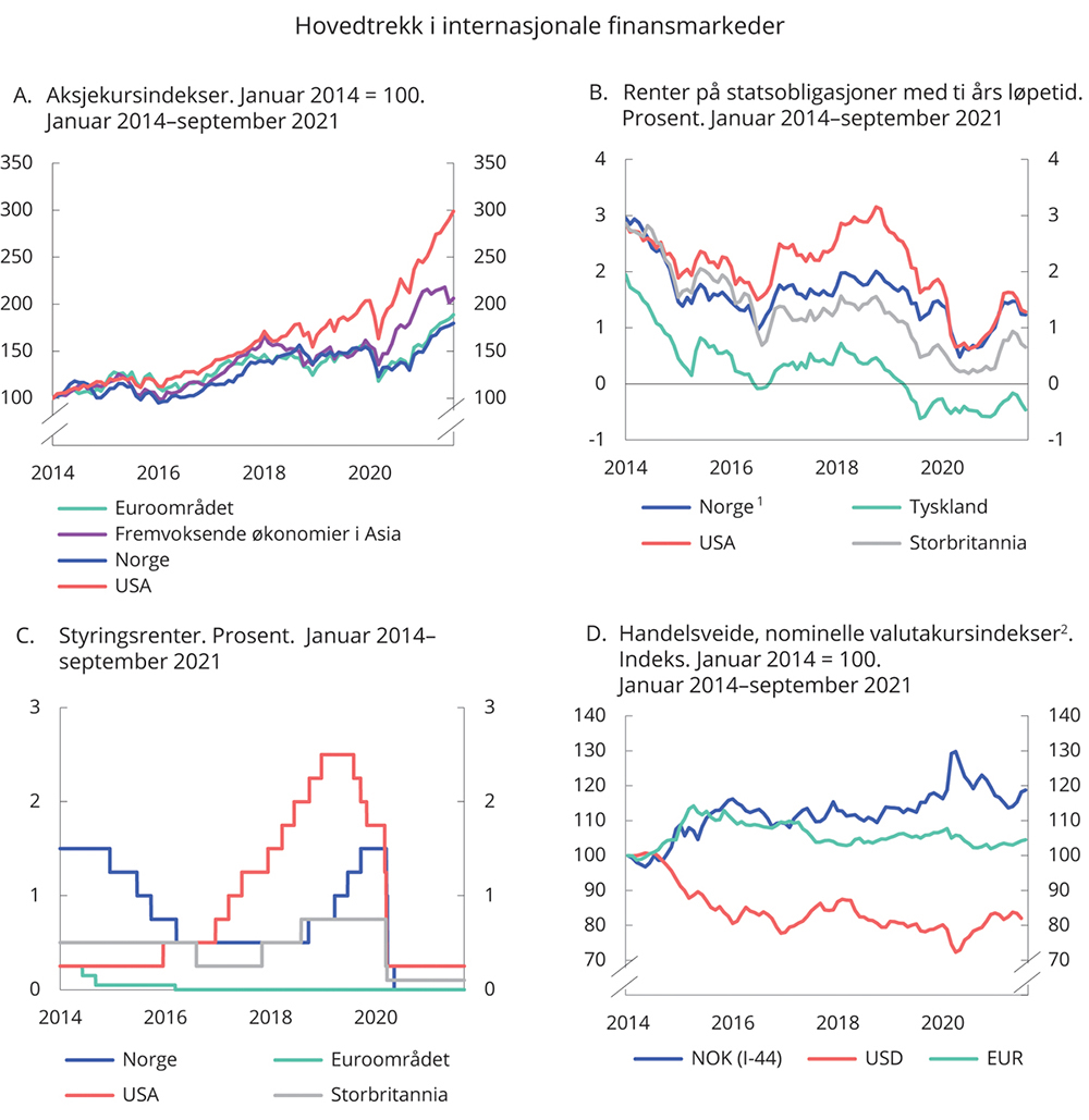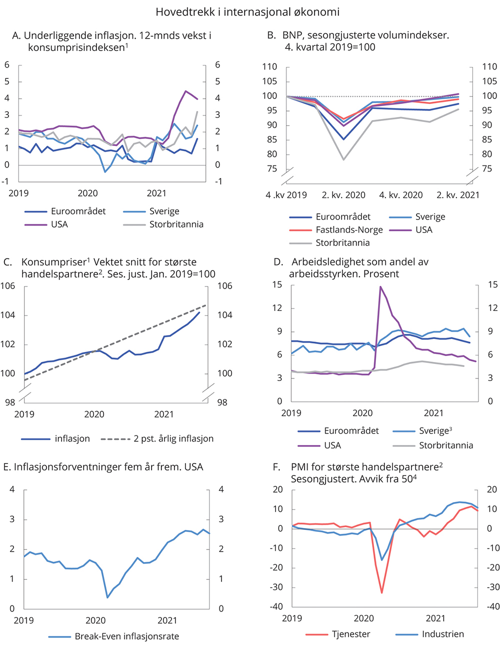 Kraftig finanspolitisk og pengepolitisk stimulans har bidratt til at husholdningenes etterspørsel etter varer og tjenester har tatt seg raskt opp, etter hvert som vaksineringen har kommet langt og de fleste smitteverntiltak er avviklet i mange av de avanserte landene. I enkelte næringer har etterspørselen økt mer enn tilbudssiden har klart å møte, med flaskehalser og etterspørselspress i flere næringer. Det har både sammenheng med at det er vanskelig å få tak i kvalifisert arbeidskraft og forstyrrelser i internasjonale verdikjeder.