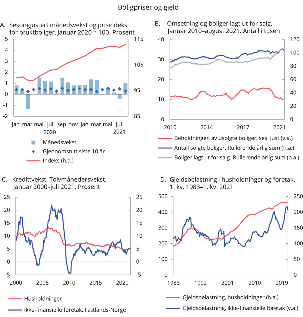 Aktiviteten i boligmarkedet har vært høy under pandemien. Prisene har steget markert og omsetningen har vært rekordhøy. De siste månedene har prisveksten avtatt, mens omsetningen har holdt seg høy. Avdempingen av boligprisveksten kan ha sammenheng med forventninger om høyere boliglånsrente. Gjenåpningen av samfunnet kan også ha bidratt, med utsikter til lavere sparing og en normalisering av husholdningenes forbruksmønster. Historisk lave renter og høy aktivitet i boligmarkedet har bidratt til at gjeldsveksten i husholdningene har økt det siste året, etter å ha avtatt over en lengre periode. Husholdningenes gjeldsbelastning er på et historisk høyt nivå og utgjør en sårbarhet i det norske finansielle systemet. Eiendomspriser, gjeld og finansiell stabilitet er nærmere omtalt i avsnitt 2.5 og 3.4.