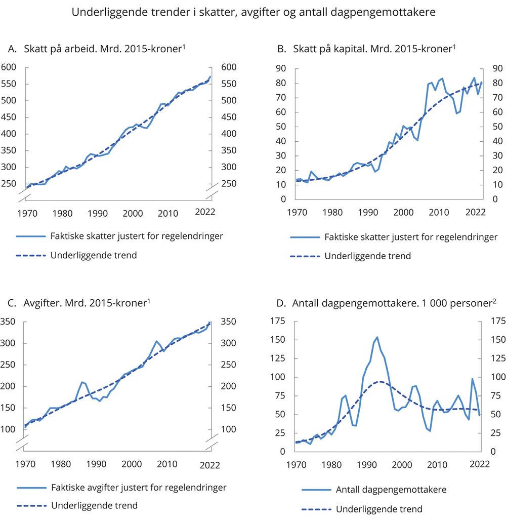 Figur 1.1 Underliggende trender i skatter, avgifter og antall dagpengemottakere