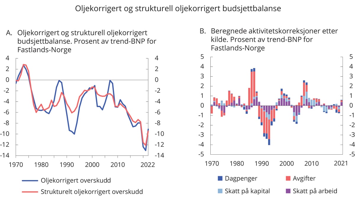 Figur 1.2A viser at variasjonen i det oljekorrigerte underskuddet er klart større enn variasjonen i det strukturelle oljekorrigerte underskuddet. Dette skyldes at en lar de automatiske stabilisatorene i budsjettet få virke, slik at konjunkturelle variasjoner i skatter og avgifter fra fastlandsøkonomien ikke skal slå ut på budsjettets utgiftsside. De beregnede aktivitetskorreksjonene i 2020 og 2021 ble mindre enn anslått i nasjonalbudsjettet for 2021, og ventes å bli positive neste år som følge av bedringen i økonomien, se figur 1.2B.
