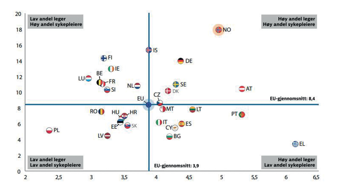 Kilder: Eurostat og NOU 2023: 4 Tid for handling – Personellet i en bærekraftig helse- og omsorgstjeneste.