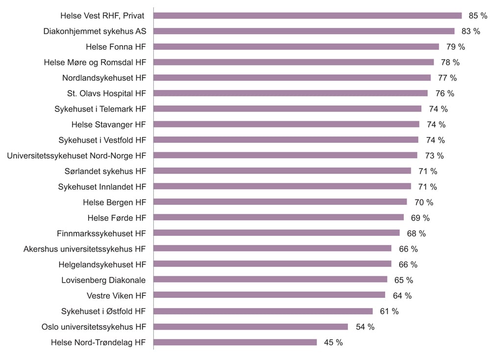 Det er en målsetning at 70 prosent av pakkeforløpene skal være gjennomført innen maksimal anbefalt forløpstid. Tabell 7.7 viser andel gjennomførte pakkeforløp kreft innen maksimal anbefalt forløpstid. De fleste kreftformer ligger over eller tett opptil målet om 70 prosent gjennomføring innen maksimal anbefalt forløpstid. Blærekreft er det pakkeforløpet der størst andel (85,5 prosent) av pakkeforløp gjennomføres innen maksimal anbefalt forløpstid. Prostatakreft (43,9 prosent) og livmorhalskreft (44,6 prosent) er pakkeforløpene hvor lavest andel gjennomføres innen maksimal anbefalt forløpstid. Figur 7.14 viser en oversikt på helseforetaksnivå over andel pakkeforløp gjennomført innen maksimal anbefalt forløpstid.