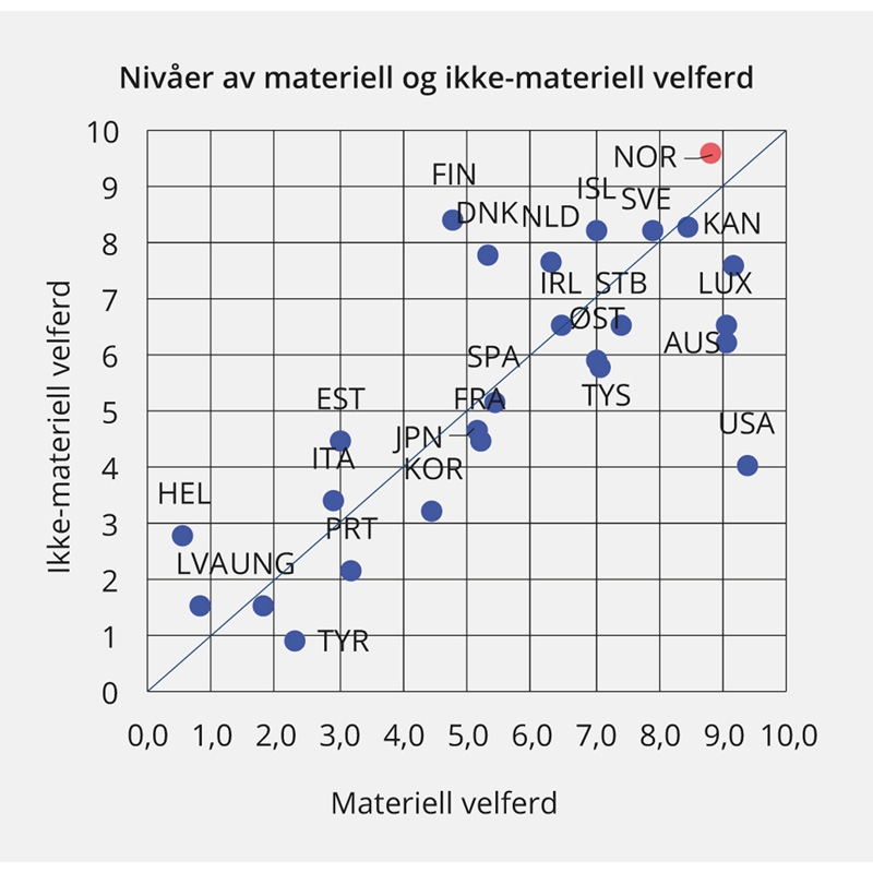 Figur 2.1 vekter sammen de ulike OECD-landenes resultater langs dimensjoner som måler materiell velferd (horisontal akse) og dimensjoner som måler ikke-materiell velferd (vertikal akse). Resultatene vises på en skala fra 1 (lav velferd) til 10 (høy velferd). Den diagonale linjen indikerer hvor landene ville vært plassert dersom det var perfekt samsvar mellom deres resultater langs materielle og ikke-materielle velferdsdimensjoner. Land som ligger over denne linjen, skårer relativt bedre langs dimensjoner for ikke-økonomisk velferd, mens land som ligger under skårer relativt bedre langs materielle velferdsdimensjoner. Figuren viser at Norge og de andre nordiske landene skårer høyt både på mål for materiell velferd og på mål for ikke-materiell velferd. Det samme gjelder for Nederland, Sveits, Canada og New Zealand.