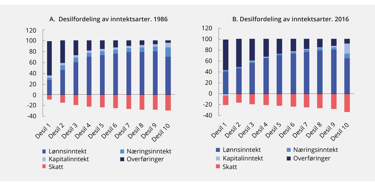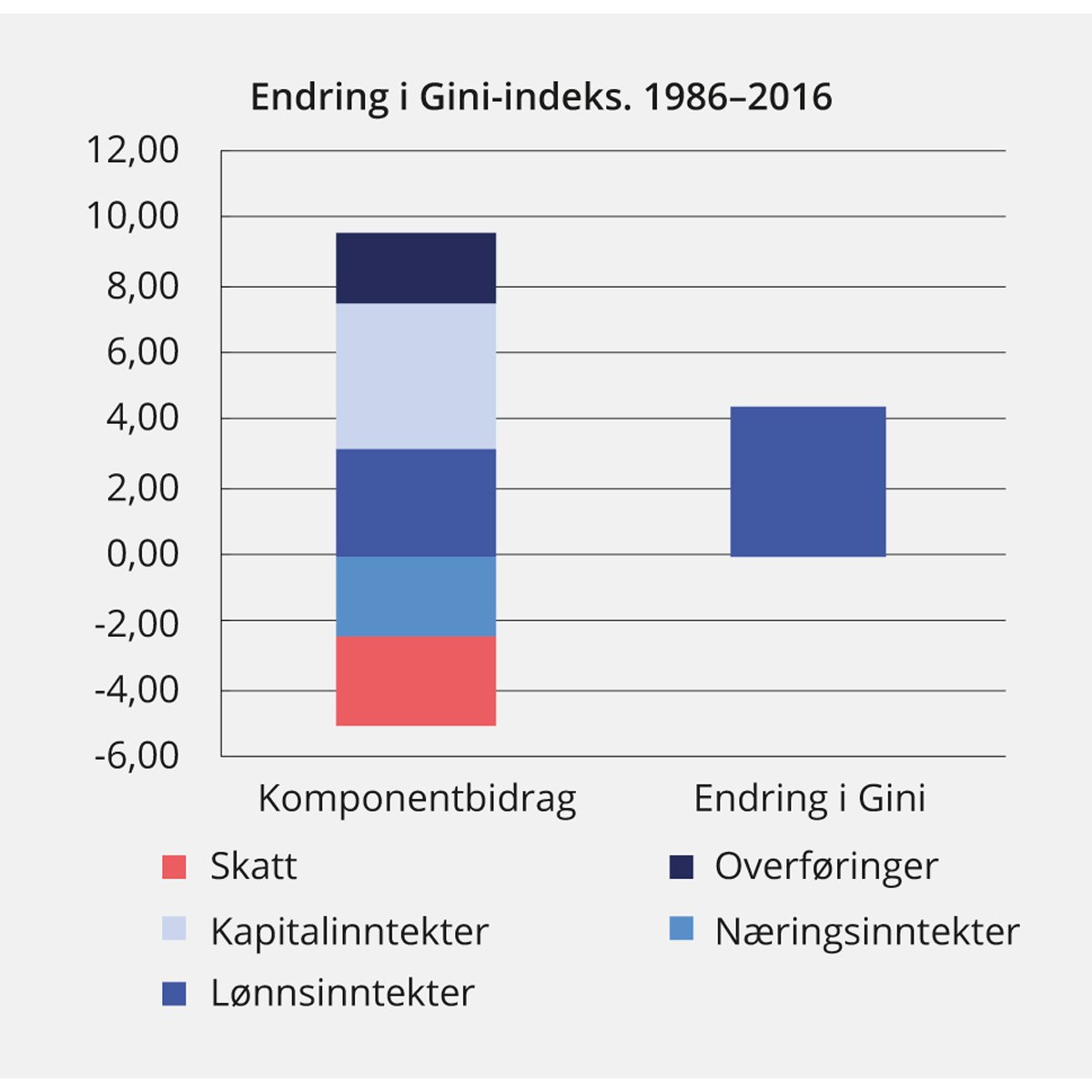 I perioden 1986–2016 økte Gini-indeksen for personer i privathusholdninger med om lag 4,5 prosentenheter, når studenter holdes utenom. Denne endringen kan dekomponeres i bidrag fra utviklingen i ulike inntektskomponenter, se boks 2.6. Statistisk sentralbyrå har beregnet bidragene fra lønns-, kapital- og næringsinntekter samt overføringer og skatt. Som omtalt i boksen er det mulig å skille mellom bidrag fra endringer i de ulike inntektsartenes andel av samlet inntekt og bidrag fra endringer i fordelingen av de enkelte inntektskomponentene på inntektsmottakerne.
