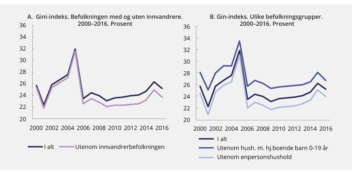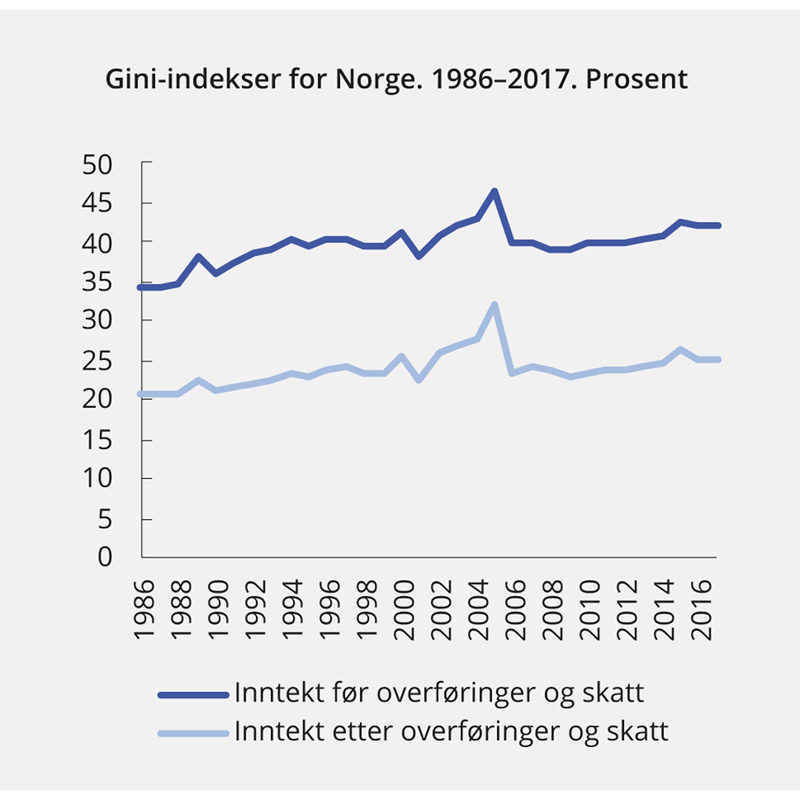 Også etter skatt har realinntektene i Norge økt sterkt siden midten av 1980-tallet. Fra 1986 til 2017 økte medianinntekten justert for husholdningenes størrelse og sammensetning med 78 prosent, mens gjennomsnittsinntekten etter skatt for 1. og 10. desil økte med henholdsvis 56 og 122 prosent. Innenfor laveste desil var inntektsutviklingen gjennomgående svakere for gruppene med lavest inntekt, mens det var motsatt innenfor øverste desil. Dette har bidratt til oppgangen i Gini-indeksen.
