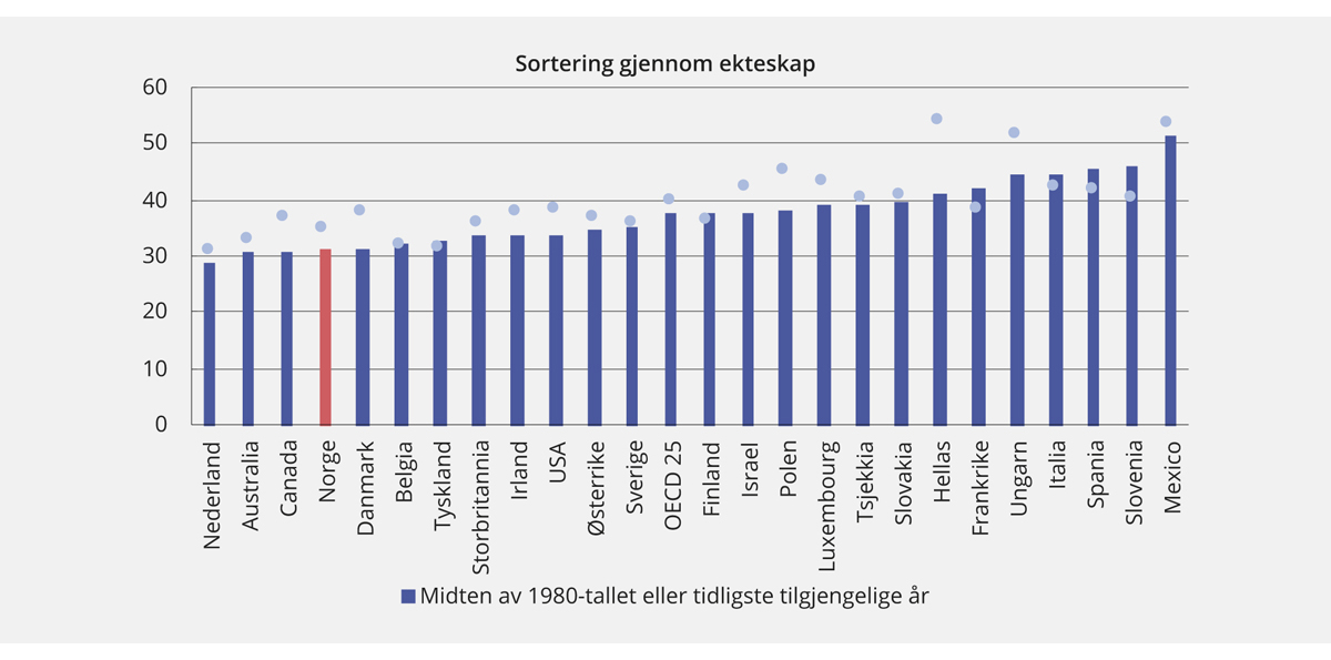 Figur 2.28 viser graden av inntektsmobilitet mellom generasjoner for et utvalg OECD-land. Inntektselastisiteten mellom sønners og fedres inntekt er målt langs den vertikale aksen og Gini-koeffisienten for ulikhet i løpende inntekt noe tilbake i tid langs den horisontale aksen. Figuren viser at det er en klar samvariasjon mellom lav ulikhet og høy mobilitet, det vil si lav samvariasjon mellom fedre og sønners inntekter. Figurene peker videre i retning av at inntektselastisiteten mellom sønner og fedre er lav i Norge, om lag 0,15. Av landene i figuren er det bare Danmark som har (litt) lavere elastisitet enn Norge og dermed (litt) høyere inntektsmobilitet. Finland og Sverige kommer på de neste plassene. Graden av inntektsmobilitet mellom generasjoner varierer mye mellom land, blant annet som en følge av forskjeller i familiepolitikk, utdanningspolitikk, organiseringen av arbeidsmarkedet og arbeidsmarkedspolitikken.