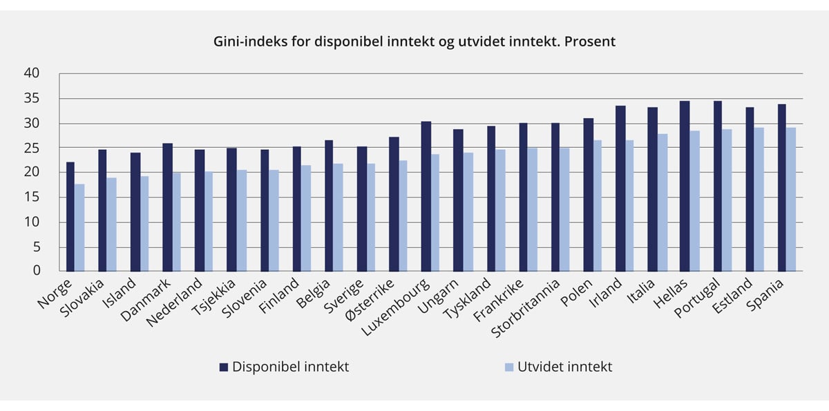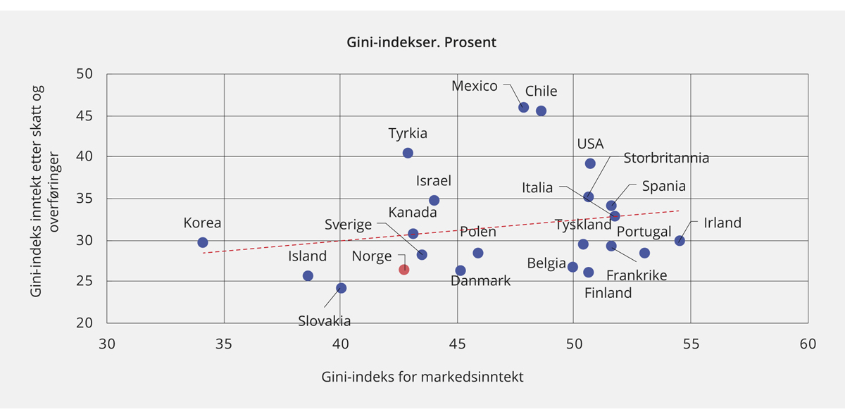 Figuren illustrerer videre at ulikheten i fordelingen av inntekt etter skatt er relativt lav i Norge sett i et internasjonalt perspektiv. Hvis vi ser på alle de 37 OECD-landene, er det fire som har noe lavere Gini-indeks enn Norge. I tillegg til Tsjekkia og Finland som er med i figuren, gjelder dette Slovenia og Slovakia. 32 av OECD-landene har dermed (til dels betydelig) mer ulik fordeling av inntekt enn i Norge. Statistisk sentralbyrå har nylig publisert tall for Gini-indeksen for Norge for 2017, som viser samme resultat som tallene for 2016.