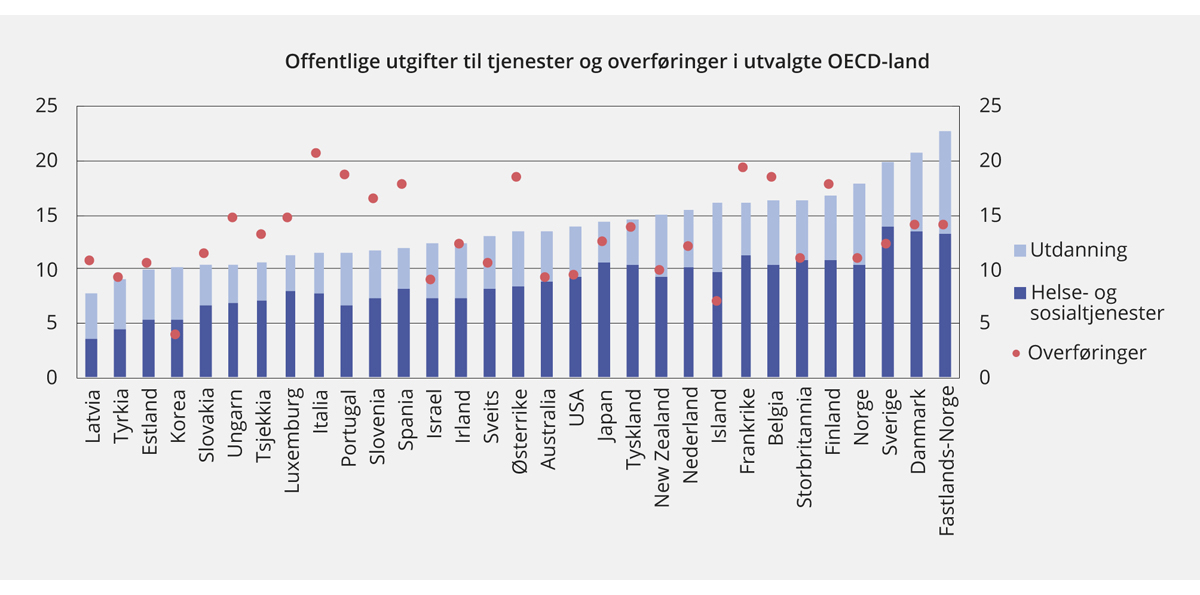 Overføringer og skatter er viktige fordelingspolitiske virkemidler, og bidraget til omfordeling er betydelig. Omfordelingsbidraget fra skatter og overføringer har holdt seg relativt stabilt i Norge de siste 30 årene, også etter reformer som har bidratt til et mer effektivt skattesystem. Skatter og avgifter er også den viktigste kilden til finansiering av universelle, offentlige helse- og utdanningstjenester. Verdien av slike tjenester dekkes ikke av de vanlige målene for inntektsulikhet. Norge har høye utgifter til offentlige tjenester sammenlignet med mange andre OECD-land. Det offentlige tjenestetilbudet virker utjevnende, og bidrar til å redusere andelen som lever med vedvarende lavinntekt (se nærmere omtale i punkt 2.4.3).