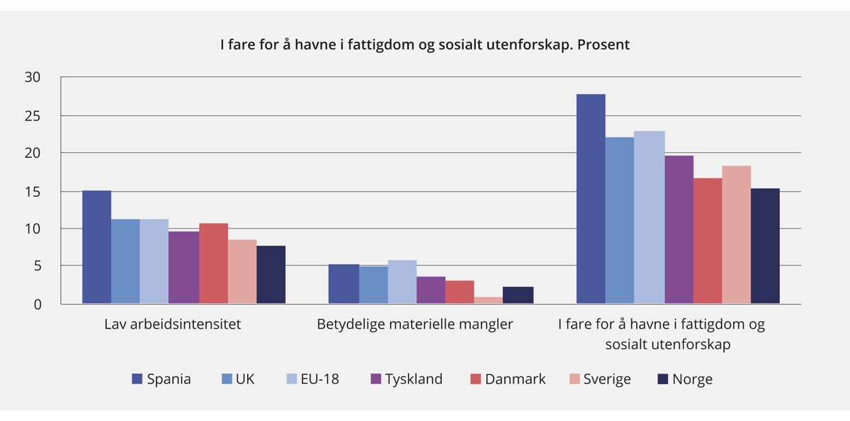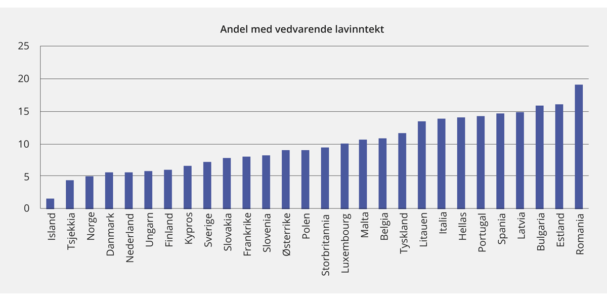 Målt i kjøpekraft er lavinntektsgrensen høyere i Norge enn i de fleste andre land. Som omtalt i avsnitt 2.4 gir også det offentlige tjenestetilbudet et betydelig tilskudd til levestandarden for mange brukere. Dette gjelder ikke minst for personer som lever med lav inntekt. For eksempel vil verdien av offentlige tjenester innenfor skole, barnehage og helsevesen ha stor betydning for økonomien til barnefamilier og barns levekår. Det er lagt frem flere studier der en har forsøkt å ta hensyn til verdien av offentlige tjenester ved målingen av lavinntekt, se omtale i avsnitt 2.4.3. Hovedbildet fra slike studier er at verdien av offentlige tjenester er om lag fordelingsmessig nøytral, men at offentlige tjenester likevel bidrar til inntektsutjevning fordi de relativt til inntekt betyr mest for personer med lave inntekter. I en studie fra 2017 anslo Aaberge m.fl. at andelen som lever i lavinntekt i Norge nærmere halveres dersom verdien av kommunale tjenester regnes med.17