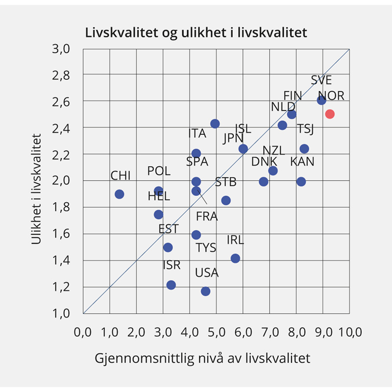 For hvert land beregner OECD også enkle mål for ulikhet i fordelingen av de anvendte indikatorene for inntekt og formue, arbeidstilknytning, balanse mellom arbeid og fritid, helse, utdanning, samfunnsengasjement og opplevd livskvalitet. Figur 2.2 viser landenes aggregerte resultater langs disse dimensjonene. Den horisontale aksen viser gjennomsnittlig nivå av livskvalitet for de enkelte landene. Den vertikale aksen viser om ulikheten i livskvalitet er stor (tall ned mot 1) eller liten (tall opp mot 3). Figuren antyder at høy gjennomsnittlig livskvalitet går sammen med lav ulikhet i livskvalitet og at Sveits, Nederland, Finland, Sverige og Norge kombinerer høye gjennomsnittsnivåer med lav ulikhet. Sverige og Norge kommer ut helt på topp. Norge kommer litt foran Sverige for gjennomsnittlig nivå og Sverige litt foran Norge for ulikhet i resultat rundt de ulike gjennomsnittene.