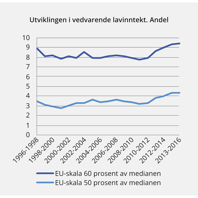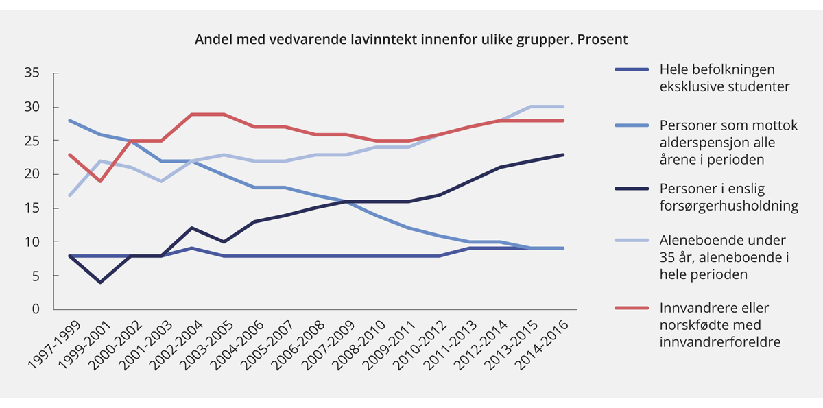 Opptrapping av minstepensjonen har ført til at det er færre eldre i gruppen. Andelen alderspensjonister med vedvarende lavinntekt har gått ned fra i underkant av 30 prosent på slutten av 1990-tallet til i underkant av 10 prosent i perioden 2014–2016. Høy innvandring og svakere arbeidstilknytning blant innvandrere enn for gjennomsnittet av befolkningen har bidratt til at antallet husholdninger med lavinntekt likevel har holdt seg oppe. Personer med innvandrerbakgrunn er overrepresentert i gruppen med vedvarende lavinntekt. Andelen med vedvarende lavinntekt blant innvandrere reduseres imidlertid betraktelig med økt botid, uavhengig av landbakgrunn. Blant arbeidsinnvandrere er andelen med vedvarende lavinntekt lavere enn for innvandrere ellers, men høyere enn for majoritetsbefolkningen. Enslige under 35 år og personer i enslig forsørgerhushold er overrepresentert i gruppen med vedvarende lavinntekt. Forekomsten av lavinntekt i disse gruppene har økt de siste årene.
