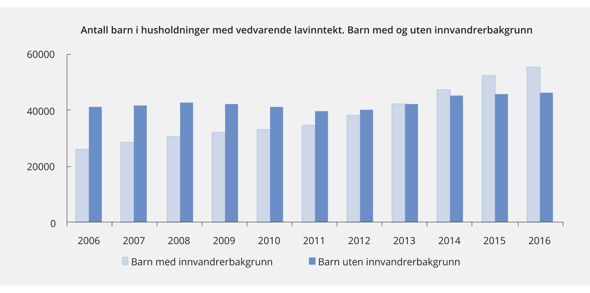 Figur 2.23 viser antall barn, med og uten innvandrerbakgrunn, som bor i husholdninger med vedvarende lavinntekt. Etter EUs lavinntektsmål var det vel 101 000 barn under 18 år som levde med vedvarende lavinntekt i 2016. Dette utgjorde 10,3 prosent av alle barn, mot 4 prosent i 2000 og 7 prosent i 2006. Antall barn med innvandrerbakgrunn som lever med lavinntekt økte fra vel 26 000 i 2006 til vel 55 000 i 2016. Til sammenligning var det i samme periode en økning fra vel 41 000 til vel 46 000 for den øvrige befolkningen. Et fellestrekk er at flere barn i lavinntektsgruppen kun har én forsørger. Det fremgår av figur 2.22 at andelen personer med lavinntekt som lever i enslig forsørgerhusholdning, er mer enn tredoblet fra perioden rundt århundreskiftet og frem til nå.
