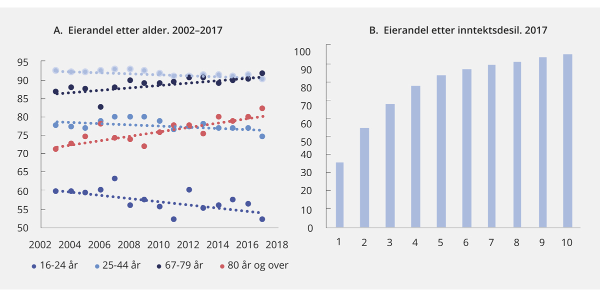 Andelen av befolkningen som bor i eid bolig, varierer med alder, utdanningsnivå og inntekt. Figur 2.25 viser andelen som bor i eid bolig fordelt etter henholdsvis alder og inntektsdesil. Andelen personer som bor i eid bolig, er lavest blant unge voksne, og andelen har gått noe ned over tid. Ifølge SSB henger dette sammen med at unge flytter ut av foreldrehjemmet tidligere enn før, blant annet for å gå på skole eller for å studere. De fleste unge flytter fra et eid foreldrehjem til en leiebolig. Samtidig har andelen unge i aldersgruppen 25–30 år som eier egen bolig, økt jevnt de senere årene, fra 34 prosent i 2004 til 42 prosent i 201525