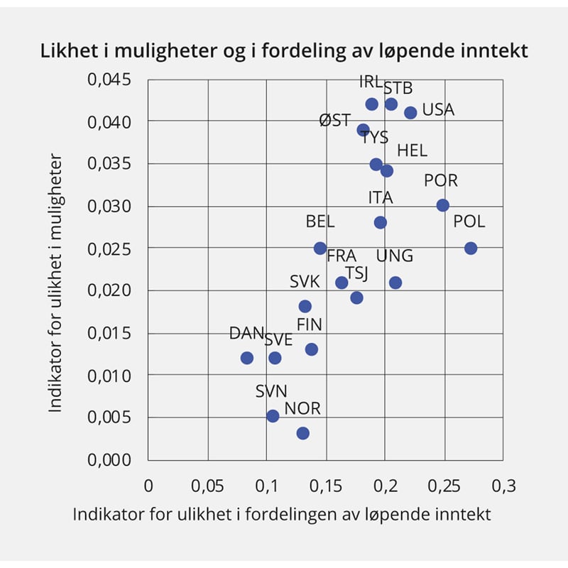 Et lignende bilde vises i en analyse av Brzezinski (2015) der Norge, andre nordiske land, Nederland og Tyskland skiller seg ut med liten ulikhet i muligheter. Disse landene har også liten endring i indikatorene for ulikhet i muligheter fra perioden før til perioden etter den internasjonale finanskrisen.35