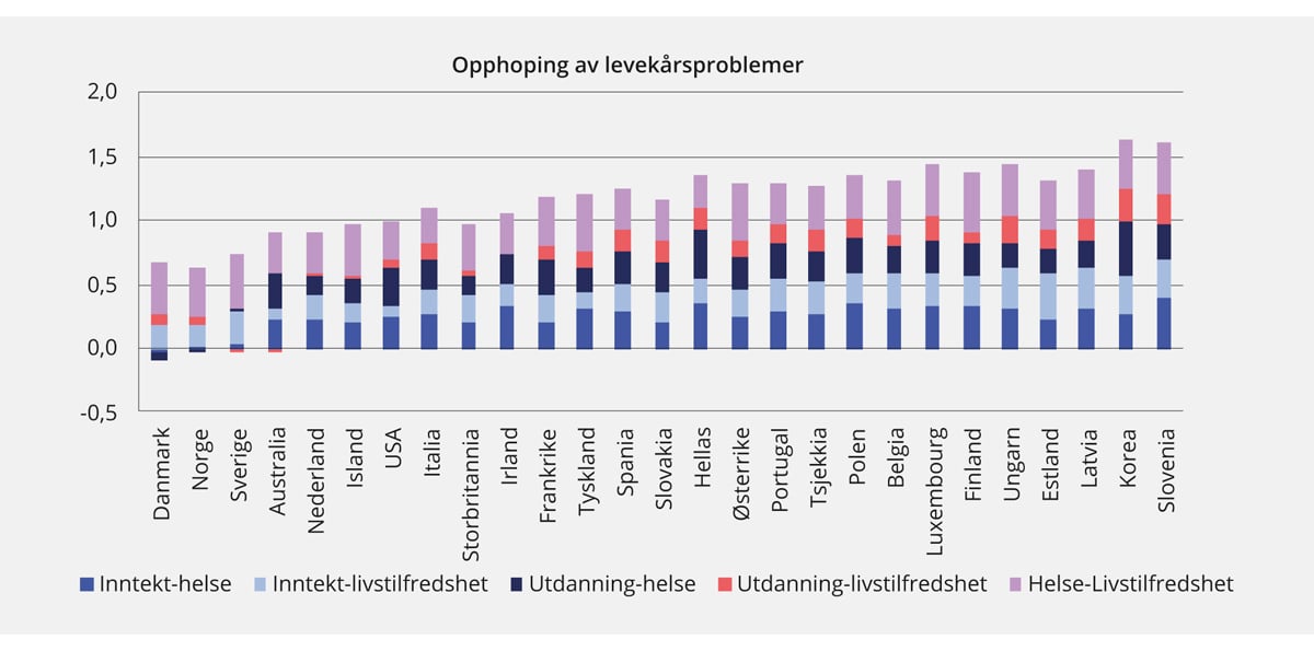 Langs fire dimensjoner har OECD også vurdert hvorvidt det er tendens til opphoping av gode og dårlige levekår innenfor befolkningen i det enkelte land. Indikatorene som er lagt til grunn er selvrapportert livskvalitet, selvrapportert helse, antall år med utdanning og disponibel husholdningsinntekt. Opphopingen er målt ved samvariasjonen mellom de fire livskvalitetsdimensjonene, se boks 2.2.