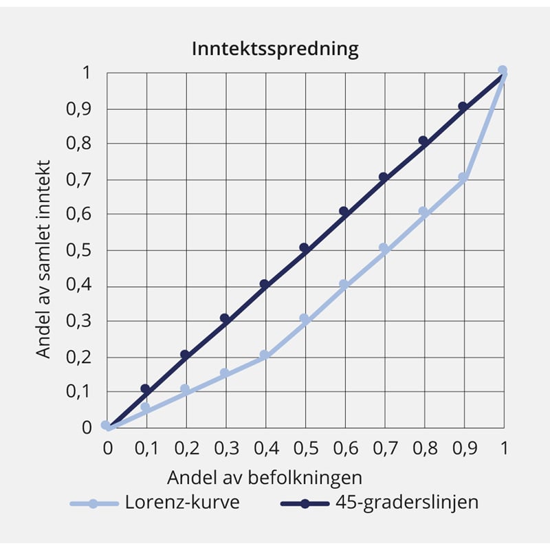 Gini-koeffisienten kan avledes fra Lorenz-kurven, som viser hvor stor andel av samlet inntekt som tilfaller en gitt andel av befolkningen når befolkningen er ordnet etter stigende inntekt. Figur 2.4 viser Lorenz-kurven for inntekt etter overføringer og skatt for Norge i 2016. Den horisontale aksen viser andeler av befolkningen rangert etter inntekt, her målt i tideler (desiler). På den vertikale aksen måles prosent av samlet inntekt. Dersom man velger et punkt langs den horisontale aksen, for eksempel 0,1, vil det tilhørende punktet på Lorenz-kurven vise hvor stor andel av samlet inntekt som tilfaller de fattigste 10 prosent av befolkningen. I et samfunn der alle har lik inntekt, vil Lorenz-kurven falle sammen med den rette 45-graderslinjen i figur 2.4 (likhetslinjen). De fattigste 10 prosent får da 10 prosent av inntekten, de fattigste 25 prosent får 25 prosent av inntekten. Jo lenger unna Lorenz-kurven 45-graderslinjen ligger, desto mer ulik er inntektsfordelingen.
