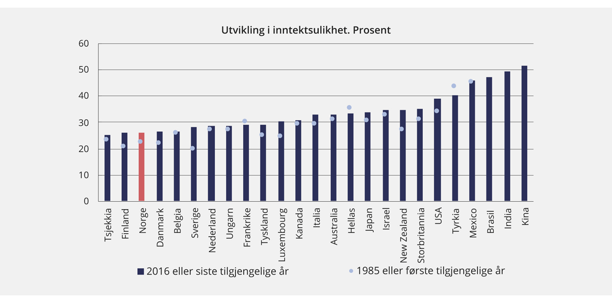 Vedvarende økonomisk vekst gjennom de siste 150 årene har løftet inntektene per innbygger i Norge til et høyt nivå. Gjennom de første to tredjedelene av denne perioden var ulikheten i fordelingen av løpende inntekt om lag like høy i Norge som i andre vestlige land. Økt utdanning, høy arbeidsdeltakelse, bedre samspill mellom partene i arbeidsmarkedet, utbyggingen av velferdssamfunnet og utformingen av skattesystemet har bidratt til en vesentlig jevnere fordeling av nettoinntektene i tiden etter annen verdenskrig. Siden midten av 1980-tallet har blant annet endringer i teknologi og i internasjonal arbeidsdeling bidratt til at inntektsfordelingen igjen er blitt noe skjevere i mange industriland, også i Norge.1 Norge er likevel fortsatt blant landene i verden med lavest ulikhet og høyest levestandard.