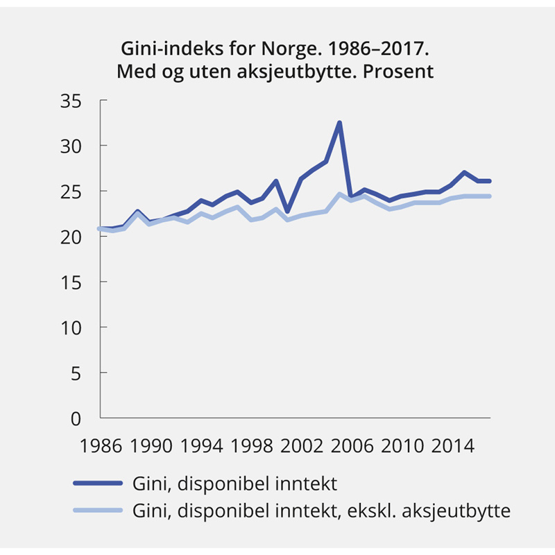 Figur 2.6 viser utviklingen i Gini-indeksen for disponibel husholdningsinntekt for Norge fra 1986 til 2017. Det fremgår av figuren at det var en sterk oppgang i Gini-indeksen for disponibel inntekt frem mot 2005, etterfulgt av en kraftig nedgang. En lignende, men svakere tendens er synlig rundt 2015. Det er nærliggende å se disse svingningene som resultater av tilpasninger til endringer i den skattemessige behandlingen av utbytte, som ga sterke insentiver til å ta ut utbytte i 2005 og 2015. Flytting av kapital fra selskap til eier gir utslag i Gini-koeffisienten for inntekt, til tross for at slik kapitalflytting ikke har en innvirkning på den reelle inntekts- og formuesfordelingen. Når utbetalingene av utbytte ikke tas med, har inntektsfordelingen vært langt mer stabil, men også i dette tilfellet indikerer Gini-indeksen at ulikheten har steget gjennom perioden. Vi ser også at begge seriene viser noen mindre svingninger fra år til år, trolig knyttet til konjunkturbevegelser og andre tilfeldige forhold.