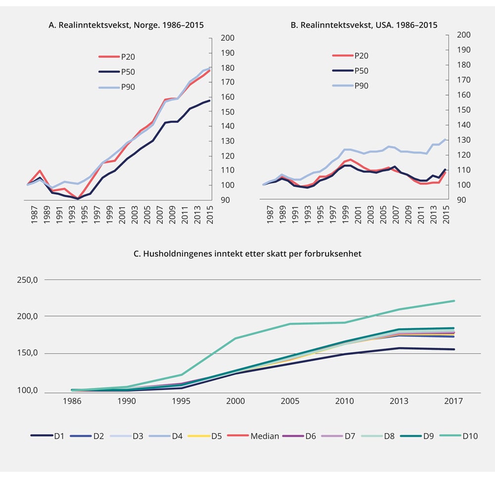 Den sterke og relativt jevne realinntektsveksten frem til oljeprisfallet gjør seg gjeldende både for grupper med relativt lav og relativt høy inntekt. Fra 1986 til 2015 har veksten i realinntekter for den rikeste tidelen av befolkningen (her målt ved grenseverdien P90) og de to tidelene med lavest inntekt (her målt ved grenseverdien P20) vært om lag like sterk. Veksten i P90 har vært om lag 80 prosent, mens veksten i P20 har vært om lag 78 prosent.