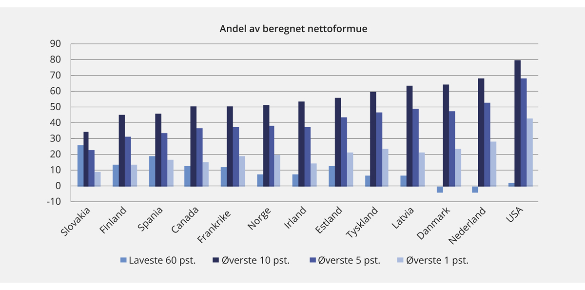 Det finnes flere land hvor fordelingen av formue er langt skjevere enn i Norge. Figur 2.9 viser hvor stor andel av samlet nettoformue som tilfaller de 10 prosent, 5 prosent og 1 prosent mest formuende, og de 60 prosent minst formuende i ulike OECD-land. USA skiller seg klart ut som det landet med mest ujevn formuesfordeling, hvor nærmere 70 prosent av samlet formue tilfaller de 5 prosent mest formuende. Når vi måler på denne måten er også Danmark blant landene med skjevere fordeling enn Norge, mens Finland, Canada og Frankrike har en jevnere fordeling. Skjevheten i formuesfordelingen i USA har tiltatt forholdsvis mye de senere årene. Fra 2010 til 2016 har andelen formue som ble eid av de 10 prosent, 5 prosent og 1 prosent mest formuende steget med henholdsvis 3,7 prosent, 7,2 prosent og 13,7 prosent.