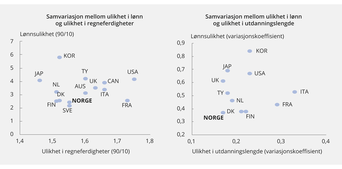Norge og de andre nordiske landene er karakterisert av små forskjeller både når det gjelder humankapital og økonomi. At et samfunn karakteriseres av relativt små forskjeller i befolkningens utdanning og ferdigheter, behøver likevel ikke bety at de økonomiske forskjellene er små. Dette er illustrert i figur 4.1. Den vertikale aksen måler lønnsulikhet, mens den horisontale aksen måler ulikhet i ferdigheter (venstre) eller utdanningslengde (høyre) blant sysselsatte. Enkelte land, som Korea og Japan, har enda jevnere fordeling av humankapitalen enn Norge, men mye større lønnsforskjeller. Frankrike har store forskjeller i humankapital, men ganske små lønnsforskjeller. Et forhold som gjerne trekkes frem for å forklare dette, er lønnsdannelsen. Den koordinerte lønnsdannelsen i de nordiske landene reduserer lønnsforskjellene mellom utdanningsgrupper (se nærmere omtale av lønnsdannelsen i kapittel 3).