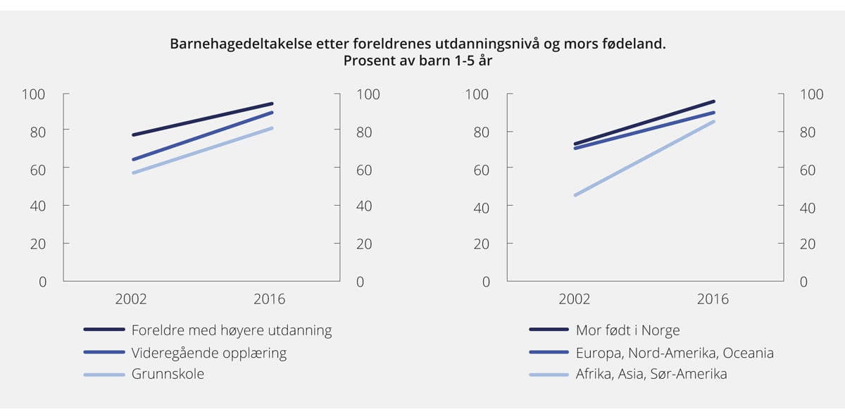 Sammenlignet med de fleste andre land har Norge en godt utbygget barnehagesektor. Utbyggingen på 2000-tallet, innføringen av en maksimalpris i foreldrebetalingen og moderasjonsordninger for lavinntektsgrupper har særlig økt barnehagedeltakelsen i grupper som erfaringsmessig har det vanskeligste utgangspunktet for å lykkes med utdanning (se figur 4.2). I 2002 gikk bare 31 prosent av barn fra lavinntektsfamilier i barnehage, mot 79 prosent i 2016.10 En ny studie dokumenterer en positiv effekt av å gå i barnehage for disse barnas språkutvikling. Barn fra lavinntektsfamilier som har gått i barnehage fra 1½ års alder, ligger langt foran i språkutviklingen ved 3 års alder sammenlignet med de som ikke har gått i barnehage. I kommuner der barnehagedeltakelsen har økt raskere for lavinntektsbarn enn for høyinntektsbarn, har gapet i språkferdigheter mellom inntektsgruppene krympet mest.11 Evalueringen av gratis kjernetid i boområder med mange innvandrere tyder på at tiltaket førte til bedre skoleprestasjoner for elever med innvandrerbakgrunn.12 I 2016 ble det innført en nasjonal ordning med gratis kjernetid for barn fra lavinntektsfamilier. Læringsmulighetene som ligger i økt barnehagedekning, kan potensielt gi et betydelig bidrag til å utjevne forskjeller i muligheter fremover.