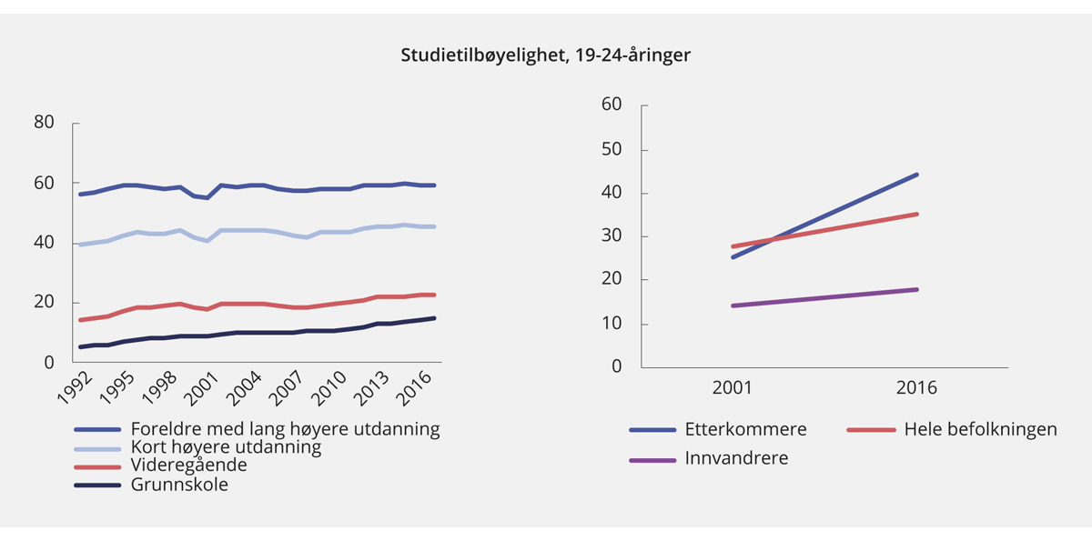 Mens utvidelse av barnehage og grunnopplæring til å omfatte alle barn og unge har bidratt til reduserte forskjeller, kan ekspansjon av høyere utdanning isolert sett bidra til større forskjeller. Dette skyldes for det første at ikke alle velger å ta høyere utdanning, slik at ikke hele befolkningen omfattes av utvidelsen. For det andre er det en viss sosial skjevrekruttering til høyere utdanning. I praksis vil mye av de offentlige midlene som brukes til høyere utdanning, tilfalle de som har de gunstigste forutsetningene. Samtidig bidrar offentlig finansiering til å gjøre høyere utdanning tilgjengelig for alle. Selv om skjevrekrutteringen fortsatt er betydelig, viser figur 4.4 at utviklingen går i riktig retning. Studietilbøyeligheten blant unge med lavt utdannede foreldre er doblet siden 1990-tallet, mens den har vært tilnærmet konstant for de med de høyest utdannede foreldrene (se figur 4.4 venstre). Blant norskfødte med innvandrerbakgrunn har utviklingen vært veldig sterk, og denne gruppen har for lengst gått forbi unge uten innvandrerbakgrunn (figur 4.4 høyre).