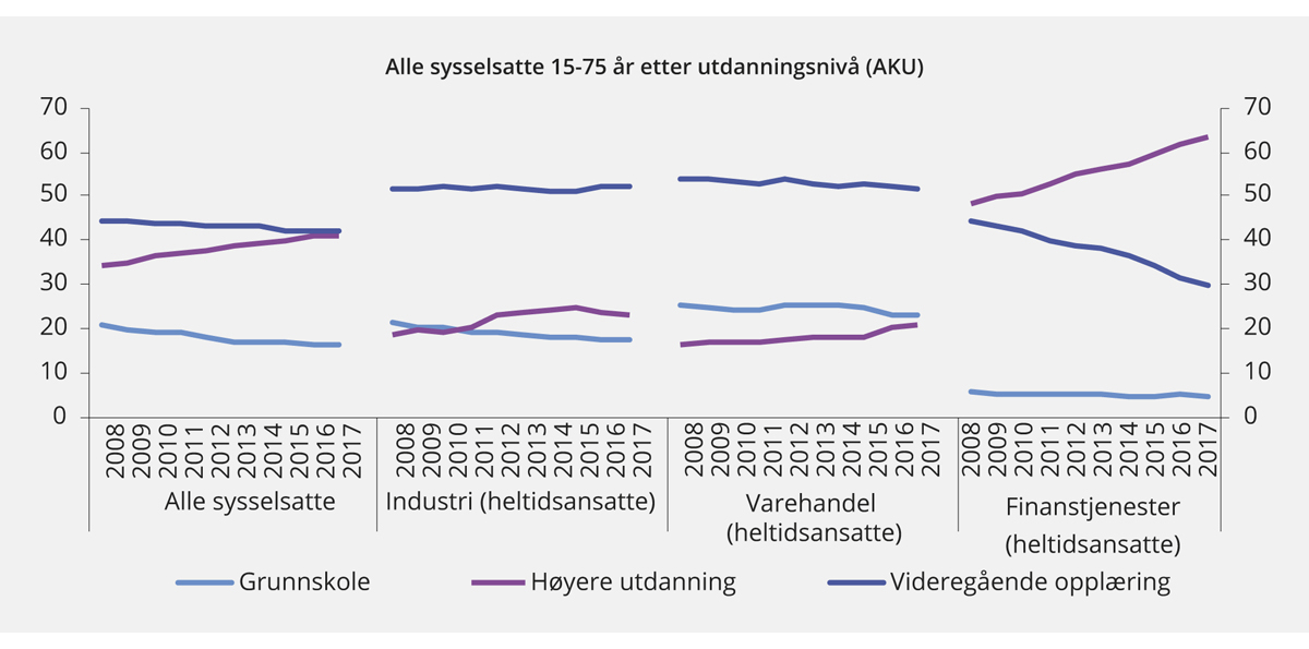 Teknologisk utvikling endrer etterspørselen etter kompetanse. I USA kom halvparten av jobbveksten fra 1980 til 2010 i nye oppgaver og yrkestitler. I Norge har jobbveksten siden 2000 nesten utelukkende kommet i yrker som krever høyere utdanning.24 Figur 4.5 viser at det har vært relativt store endringer i de sysselsattes utdanning bare de siste ti årene. Andelen med grunnskole og videregående utdanning har gått ned, mens andelen med høyere utdanning har økt. I industri og varehandel har endringene ikke vært så tydelige, mens de er markante i finansnæringen.
