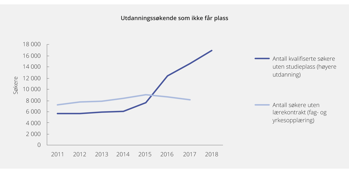 Gode økonomiske tider drevet av høye oljeinntekter gjorde at det lenge var mulig for mange å få jobb uten å fullføre en utdanning. I tillegg til at lønnspremien ved utdanning er lav i Norge, er dette antakelig noe av forklaringen på det omfattende frafallet fra både videregående og høyere utdanning, og på at det er færre som har tatt lange utdanninger og utdanninger innenfor teknologiske fag, enn i sammenlignbare land. Arbeidsinnvandring,32 finanskrise og oljeprisfall har endret dette, og ungdom søker seg til «matnyttige» fag som aldri før. Utdanningssystemet har respondert med å øke kapasiteten, men ikke tilstrekkelig til å ta unna for den sterke søknadsveksten i samme periode. Det er fortsatt mangel på læreplasser, og antall kvalifiserte søkere til høyere utdanning som står uten studieplass, er mer enn doblet på bare tre år (se figur 4.6).
