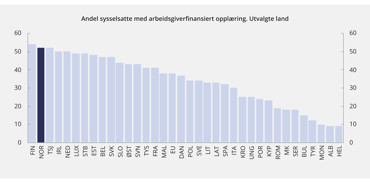Figur 4.7 tyder på at norske virksomheter bruker relativt mye ressurser på kompetanseutvikling i internasjonal målestokk. Ifølge NHOs kompetansebarometer er kompetanseheving av egne ansatte den viktigste strategien for å dekke kompetansebehov, tett fulgt av nyrekruttering. Noen forhold ved det norske arbeidslivet kan øke arbeidsgiveres insentiver til å investere i de ansattes kompetanse. Et relativt sterkt vern mot individuell oppsigelse gjør det mindre aktuelt å erstatte eksisterende ansatte med nyrekrutterte med høyere kompetanse. I Norge har arbeidsgiver i tillegg en lovfestet plikt til å sørge for tilstrekkelig opplæring.