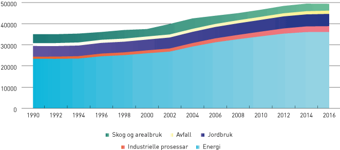 Figur 2.2 Figuren viser globale utslepp i millionar tonn CO2 ekvivalentar frå sektorane energi (mellom anna elektrisitet og varmeproduksjon, transport, bygg og anlegg), industrielle prosessar (mellom anna sement, F-gassar), jordbruk (m.a. enterisk fermentering, risproduksjon), avfall (mellom anna deponi, handtering av avløpsvatn, kloakk) og utslepp frå arealbruksendringar og skogbruk i perioden 1990–2016.