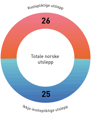 Figur 2.6 viser fordelinga av kvotepliktige og ikkje-kvotepliktige utslepp. Om lag halvparten av utsleppa er kvotepliktige. Av dei totale utsleppa i 2019 var det 24,6 millionar tonn som var ikkje-kvotepliktige. Dei kvotepliktige utsleppa kjem i hovudsak frå industri og olje- og gassutvinning. I tillegg er det nokre kvotepliktige utslepp frå energiforsyning og luftfart. Dei største kjeldene til ikkje-kvotepliktige utslepp er vegtrafikk, annan transport og jordbruk. I tillegg er det nokre ikkje-kvotepliktige utslepp frå f-gassar, petroleum, industri og andre kjelder, slik som bygg.