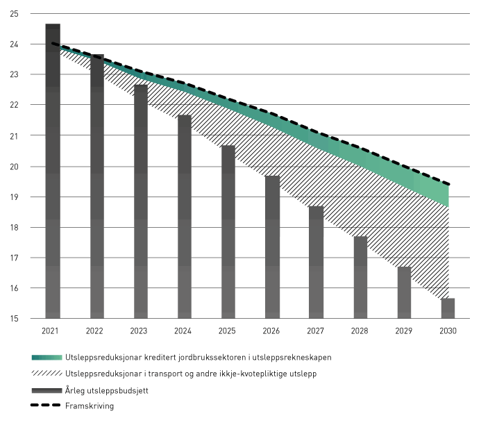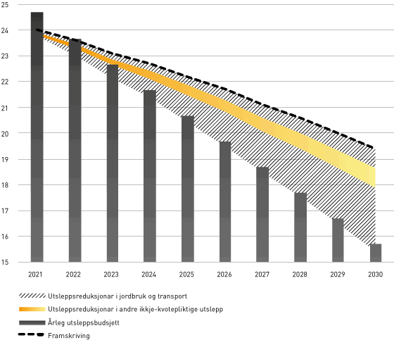 Utsleppsbudsjettet Noreg får basert på målet om 40 prosent utsleppsreduksjon, er ikkje endeleg fastsett. Basert på dei tala vi har no, vil budsjettet vere på 210 millionar tonn over perioden 2021–20301. Framskrivinga viser at utsleppa over dei ti åra er på i overkant av 218 millionar tonn CO2-ekvivalentar, og det samla utsleppsgapet er på 8,4 millionar tonn CO2-ekvivalentar over perioden.