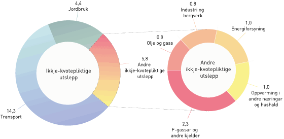 Dei ikkje-kvotepliktige utsleppa utgjorde totalt 24,6 millionar tonn CO2-ekvivalentar i 2019, om lag halvparten av totale utslepp, utanom skog og annan arealbruk. Desse utsleppa er reduserte med om lag 11 prosent frå 2005 til 2019.