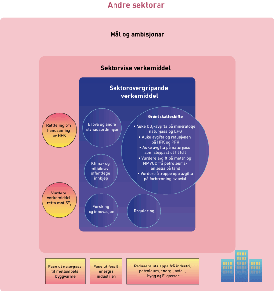 Den gradvise opptrappinga av CO2-avgifta er eit viktig verkemiddel for å gradvis fase ut fossil fyring i industrien, og det kan gje betydelege utsleppskutt i perioden. Viss det blir behov for det, vil regjeringa fortløpande vurdere ytterlegare verkemiddel, irekna eit eventuelt forbod. Regjeringa legg òg til grunn å gradvis fase ut bruken av naturgass til mellombels byggvarme. Utsleppa av HFK og PFK er venta å gå ned betydeleg som følgje av auka avgift og ein tilsvarande auke i avgiftsrefusjonen saman med meir rettleiing og meir tilsyn.