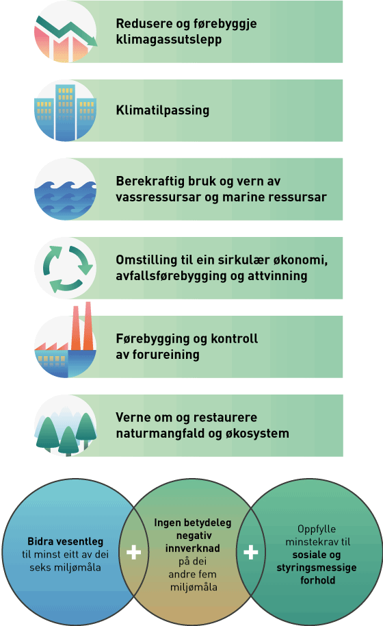 For at ein økonomisk aktivitet skal kunne definerast som berekraftig etter taksonomien til EU, må han bidra vesentleg til å nå minst eitt av seks definerte miljømål, som vist i dei grøne boksane. Aktiviteten kan i tillegg ikkje ha ein betydeleg negativ innverknad på dei andre fem miljømåla, og må oppfylle minstekrava til sosiale og styringsmessige forhold.