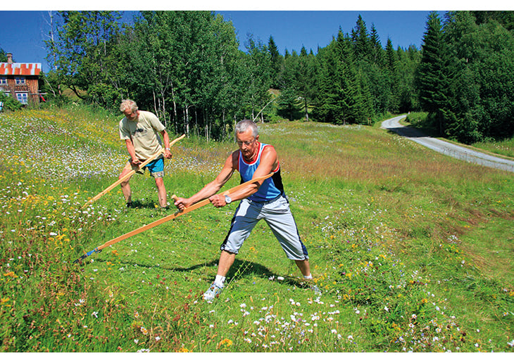 Figur 2.14 Slåttemark er en artsrik naturtype i tilbakegang. Den opprettholdes bare ved slått. Slåttedag i Færbygda i Stjørdal.