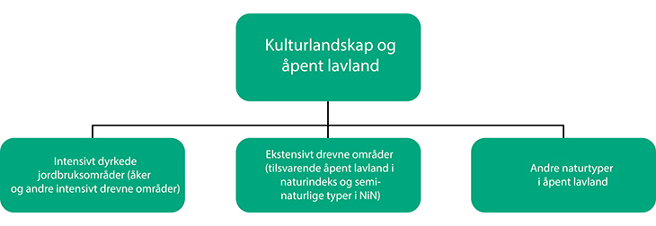 Kulturlandskap og åpent lavland omfatter dyrkede områder (åker), ekstensivt drevne områder (gamle kulturmarker) og andre naturtyper i åpent lavland som faller utenfor de to første kategoriene (se figur 2.1). Hovedøkosystemet omfatter både naturtyper som er formet av langvarig bruk, og naturtyper som ikke er det. Andre naturtyper i åpent lavland er en samlebetegnelse på annen natur under skoggrensen som på grunn av tynt jordsmonn, ras og andre forstyrrelser ikke vokser til med skog. Naturtyper som hører hjemme her, er ikke kulturbetingede.