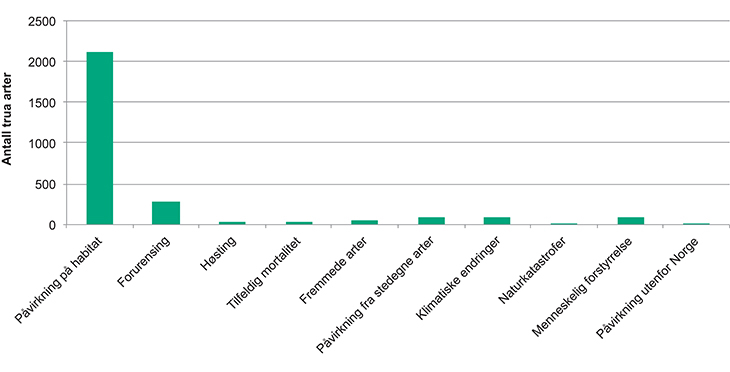 Søylene angir antall truede arter som er påvirket av de ulike påvirkningsfaktorene. En art kan være påvirket av flere påvirkningsfaktorer og summen av arter innen hver påvirkningsfaktor er derfor større enn antall truede arter.