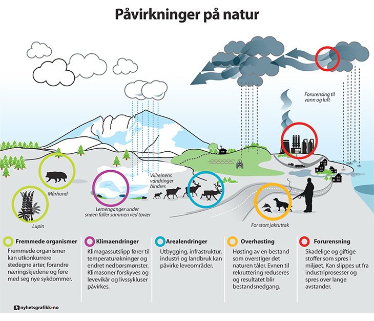 Figuren viser påvirkninger på natur. De viktigste er fremmede organismer, klimaendringer, arealendringer, overhøsting og forurensning.